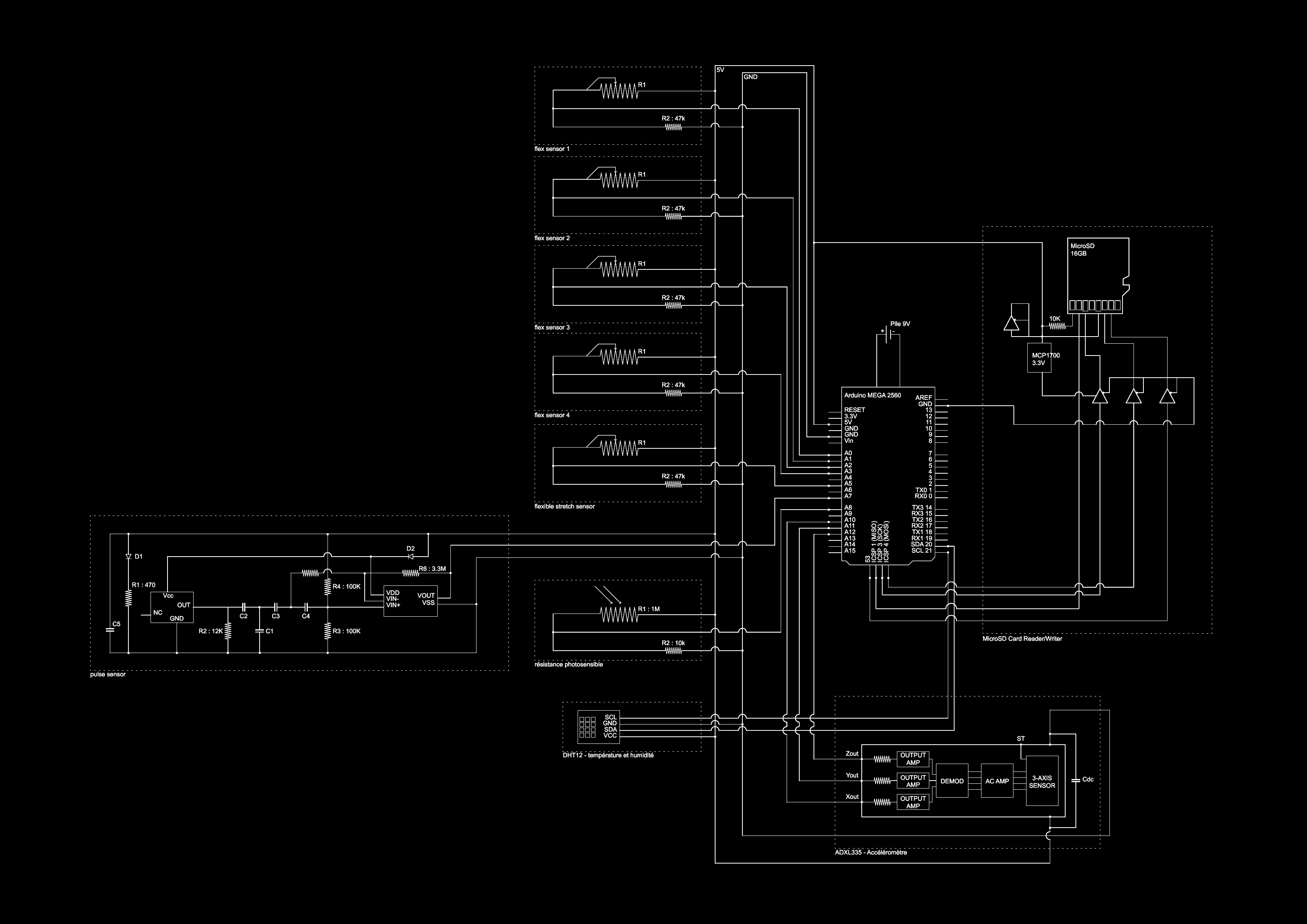 The ‘Ce que ça peut être’ project was firstly composed of a set of sensors that we made several people wear. This suit was comprised of the following sensors: